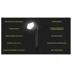 Multi angle adjustable, the solar spot-lights outdoor is suitable for porch, path, pool, yard, garden, garage,driveway, pathway, etc. Solar panel turn the sunlight into impetus directly, energy saving and environment friendly thanks to its solar power technology.