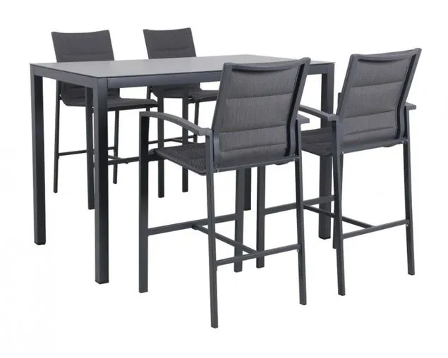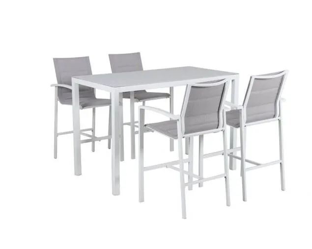 Summertime outdoor entertaining fun just got easier with the chic Boston 5-piece Bar dining experience. Stylish hard-wearing textiline sling set off the printed glass table top with aluminium frame, both chairs and table available in either white or gunmetal grey.