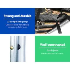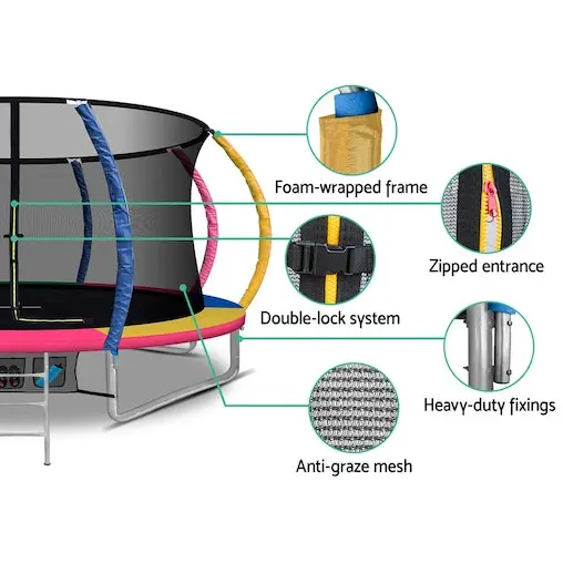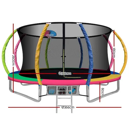 Bounce to your hearts content with the Everfit Trampoline. With its superior bounce characteristics featuring 72-piece triple rate springs, the 12-foot Trampoline enables safe and durable bouncing with no worries. The heavy-gauge steel framework is designed to handle all robust play and is UV-tested for quality and reliability. Other great features include a curve design for more rigidness, 20mm thick padding, anti-graze mat, safety netting and a double-lock zip-and-clip entry. Not least, the included basketball hoop, basketball and pump really adds an awesome fun factor to the entire ensemble.