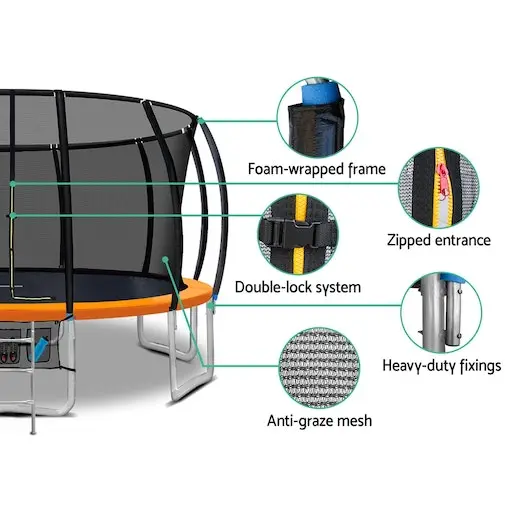Bounce to your hearts content with the Everfit Trampoline. With its superior bounce characteristics featuring 108-piece triple rate springs, the 16-foot Trampoline enables safe and durable bouncing with no worries. The heavy-gauge steel framework is designed to handle all robust play and is UV-tested for quality and reliability. Other great features include a curve design for more rigidness, 20mm thick padding, anti-graze mat, safety netting and a double-lock zip-and-clip entry. Not least, the included basketball hoop, basketball and pump really adds an awesome fun factor to the entire ensemble.