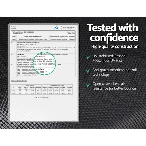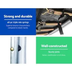 Bounce to your hearts content with the Trampoline. With its superior bounce characteristics featuring 48-piece triple rate springs, the 8-foot Trampoline enables safe and durable bouncing with no worries. The heavy-gauge steel framework is designed to handle all robust play and is UV-tested for quality and reliability. Other great features include a curve design for more rigidness, 20mm thick padding, anti-graze mat, safety netting and a double-lock zip-and-clip entry. So jump to it and order the Trampoline today.