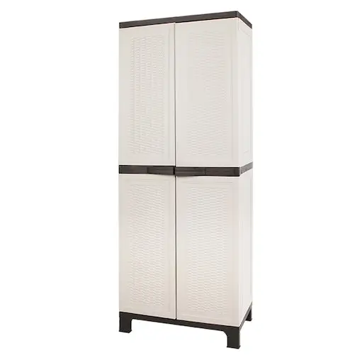 Outside, the weather-resistant Storage Cabinet features premium plastic construction with corrugated panels for both reinforced support and stylish looks. Security and safety is also enhanced with lockable doors that can be secured with a range of locks. Not least, the entire unit stands on large stilted feet to keep it away from floods, spills or wet floors.