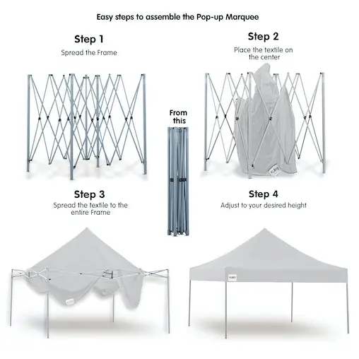 Our strong triangulated frame system means this marquee comprises only 2 main parts. The frame is one complete assembly which expands to 3x3m and the roof is fitted over the frame as it unfolds, giving you instant cover from rain or sun! You can then set the height of the legs and fit the walls if required. When you’re done you can just as easily fold the frame and roof away into the carry bag we provide, ready for transport or storage. The entire setup process will take 2 or 3 people just a few minutes!