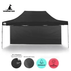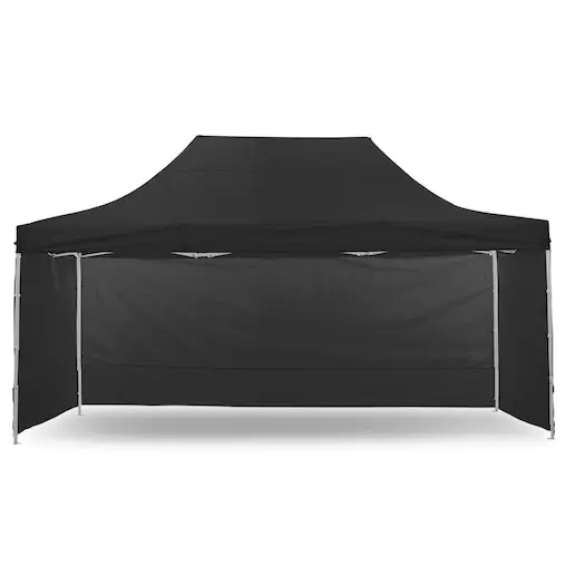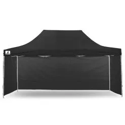 Ready when you are: Our strong triangulated frame system means this marquee comprises only 2 main parts. The frame is one complete assembly which expands to 3×4.5m and the roof is fitted over the frame as it unfolds, giving you instant cover from rain or sun! You can then set the height of the legs and fit the walls if required. When you’re done you can just as easily fold the frame and roof away into the carry bag we provide, ready for transport or storage. The entire setup process will take 2 or 3 people just a few minutes!