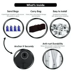 Due to the size of this item it is not possible to determine the type of fixing that may be required in all circumstances and uses. It is important for the user to determine how and where the item is used and to be aware that the structure needs to be adequately secured to prevent damage to the structure and/or injury to people due to wind. In some circumstances (eg: wind-sheltered courtyards) it may be adequate to use sandbags and light guy ropes to secure the item. The user must keep in mind that this item has a large surface area and may need to be guyed down to other fixed structures, heavy sandbags, or a combination of both to prevent damage from wind. The adequate measures required to secure the structure under the circumstances of its use are left to the user to decide.