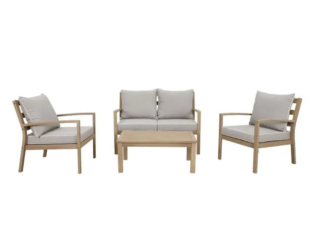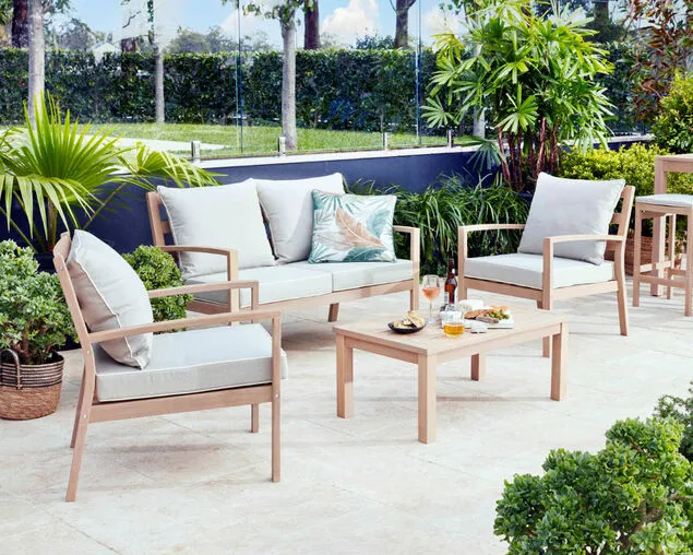 The Harper collection is made with a sustainable FSC Eucalyptus Grandis timber in a light Teak colour finish and includes Natural coloured cushions with white piping. The 4 Piece Lounge includes 2 Single Lounges, 1 Double Lounge and a 90 x 55cm coffee table. Available in a Sunlounge, Bar, Low Dining, 7 and 9 piece setting.