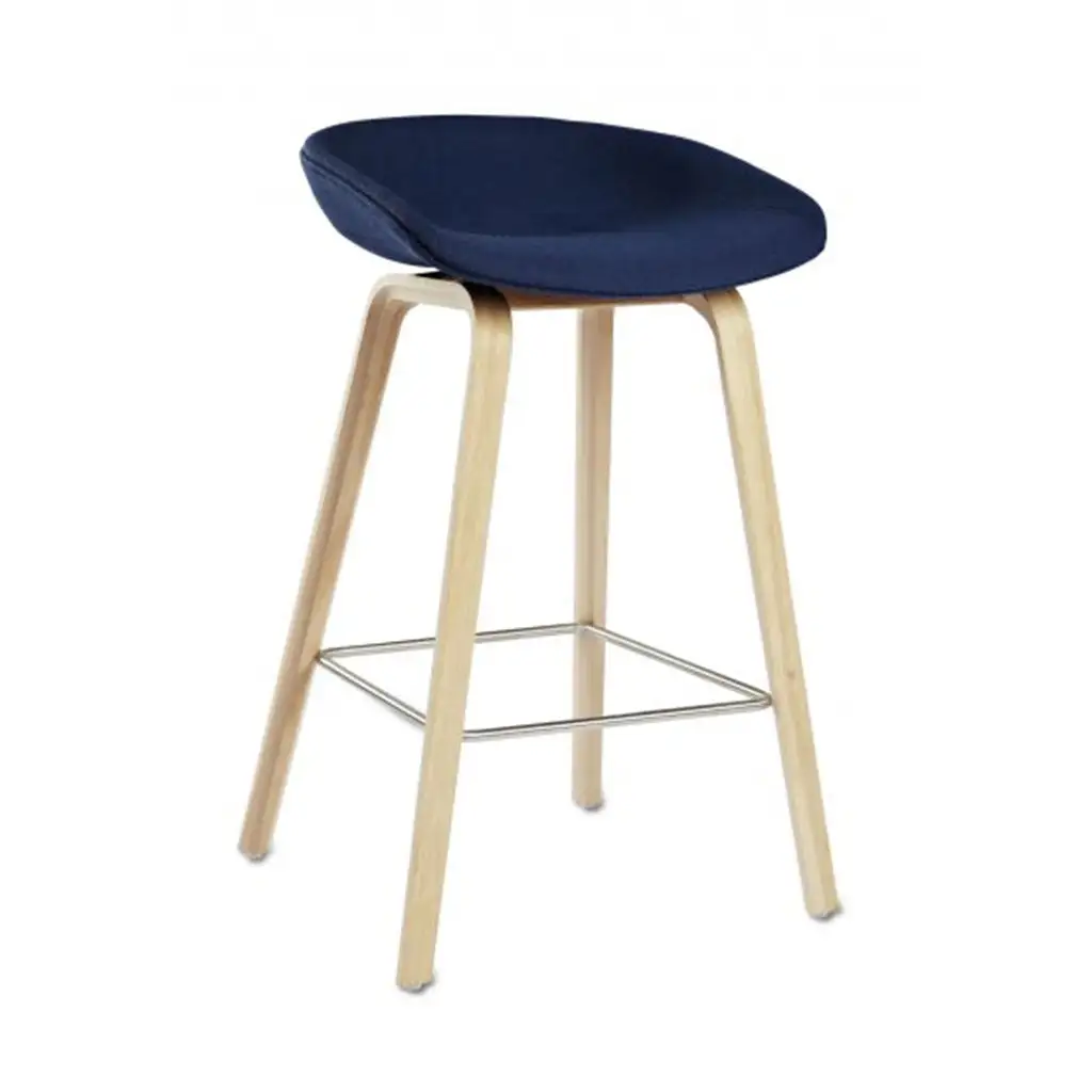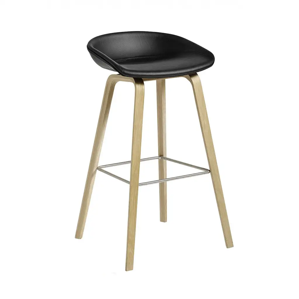 The bar stool About A Stool AAS33 has the same capacity for transformation as the other designs in the series. With a curved backrest and long, elegant wooden legs, it enjoys a simple yet strong visual presence that makes it ideal as a bar stool in a public environment, as well as for informal meetings and meals. Available in two heights and in a range of wood finishes, upholstery options.