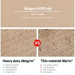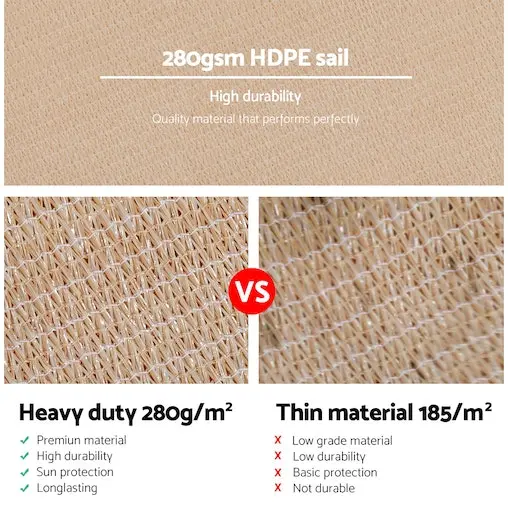 Designed to be a permanent covering, our Shade Sail is made from highly breathable 280g/m2 commercial grade 100% polyethylene fabric. This allows cooling air to pass through and help keep the under shade areas well ventilated. The material also blocks up to 98% of harmful UV rays and is all-weather proof to suit Australian climatic conditions. Plus, the material is further enhanced with Americhem UV-resistant additive from the USA to prolong its UV protection effectiveness.