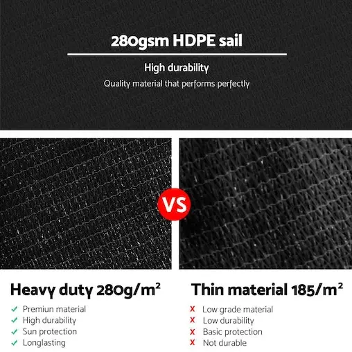 Designed to be a permanent covering, our Shade Sail is made from highly breathable 280g/m2 commercial grade 100% polyethylene fabric. This allows cooling air to pass through and help keep the under shade areas well ventilated. The material also blocks up to 98% of harmful UV rays and is all-weather proof to suit Australian climatic conditions. Plus, the material is further enhanced with Americhem UV-resistant additive from the USA to prolong its UV protection effectiveness.