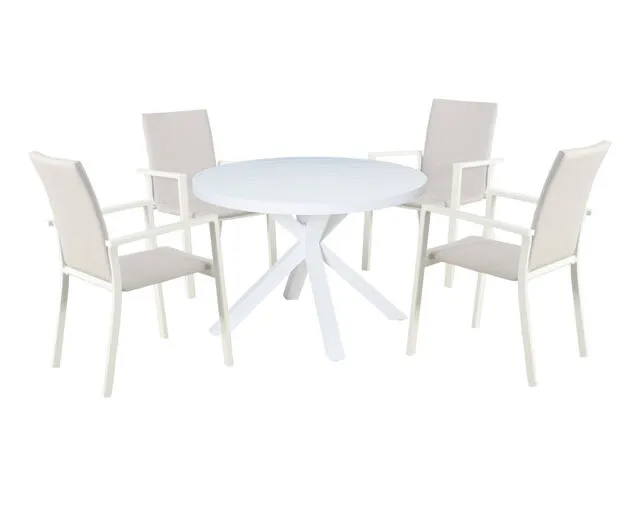 The stylish Jette Quick Dry 5 Piece Dining setting includes a rust proof aluminium powdercoated table & 4 quick dry Jette Dining chairs. The Jette quick dry Dining Chair has a generous padded seat and back, the seat being padded allows for quicker drying when wet. Both table and chairs are available in gunmetal grey and white designs.