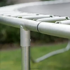 This is a heavy trampoline and uses linked legs and grounding straps for superior stability. The structure of the legs also minimises the tendency for legs to dig into the ground.