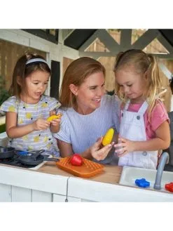 Kids will race outdoors to set up house. The play kitchen and barbeque grill let kids cook a variety of play food. Hanging pegs keep the accessory set handy and organized.