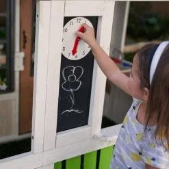 Double-sided creativity boards and clocks set the menu and opening hours of their pretend ‘restaurant.’ Kids will love the two entrances-the traditional door and the whimsical ‘pet’ door with fringe-style strips.