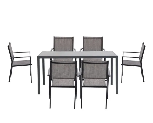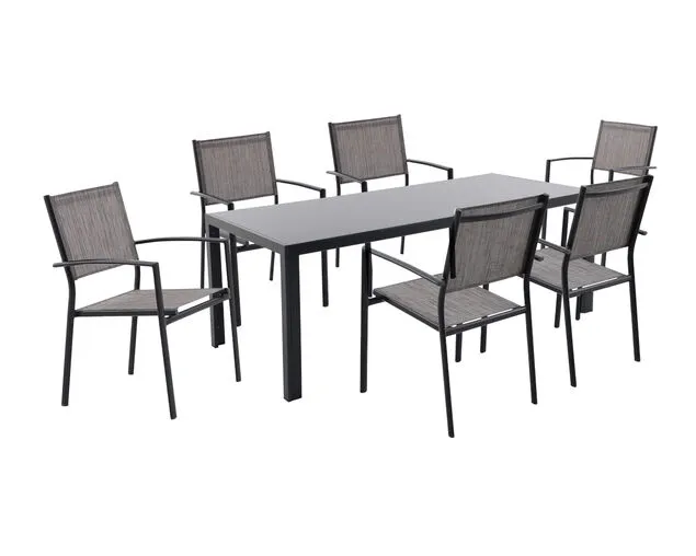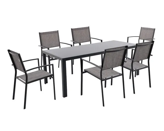 The Malmo range is an affordable aluminium range and ideal for customers seeking contemporary style and durable quality whilst on a tight budget. The 7 Piece Setting includes 6 comfortable textilene dining chairs and a 150cm dining table. The Malmo is also available as a 9 piece setting with a 200cm dining table included. Two years structural warranty, 1 year sling warranty.