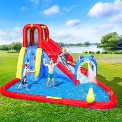 Additionally, you get a bonus carry bag and repair kit and water jet set and hose connection with this inflatable water slide jumping castle. The large, inflated pillows with fully netted walls ensure your kids’ safety.